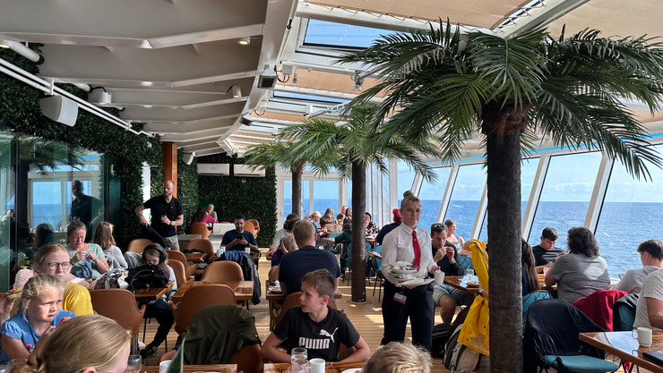 Eager to begin the next leg of our trip, we awoke early to catch the 8:30 am ferry to the southern tip of Norway! After strapping our bikes down for the journey, we made our way up to the breakfast buffet area. Brian had figured out that if we booked the buffet we would get a guaranteed seat and unlimited food for the entire journey, which was a much better deal than a regular ticket. However, if you have read any of our previous posts, you will know I am not the biggest fan of sea travel as I am very prone to seasickness. Thankfully, the combination of calm seas and Dramamine allowed me to fully enjoy the breakfast spread during our three-hour crossing.